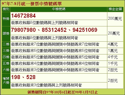97年7-8月統一發票中獎號碼